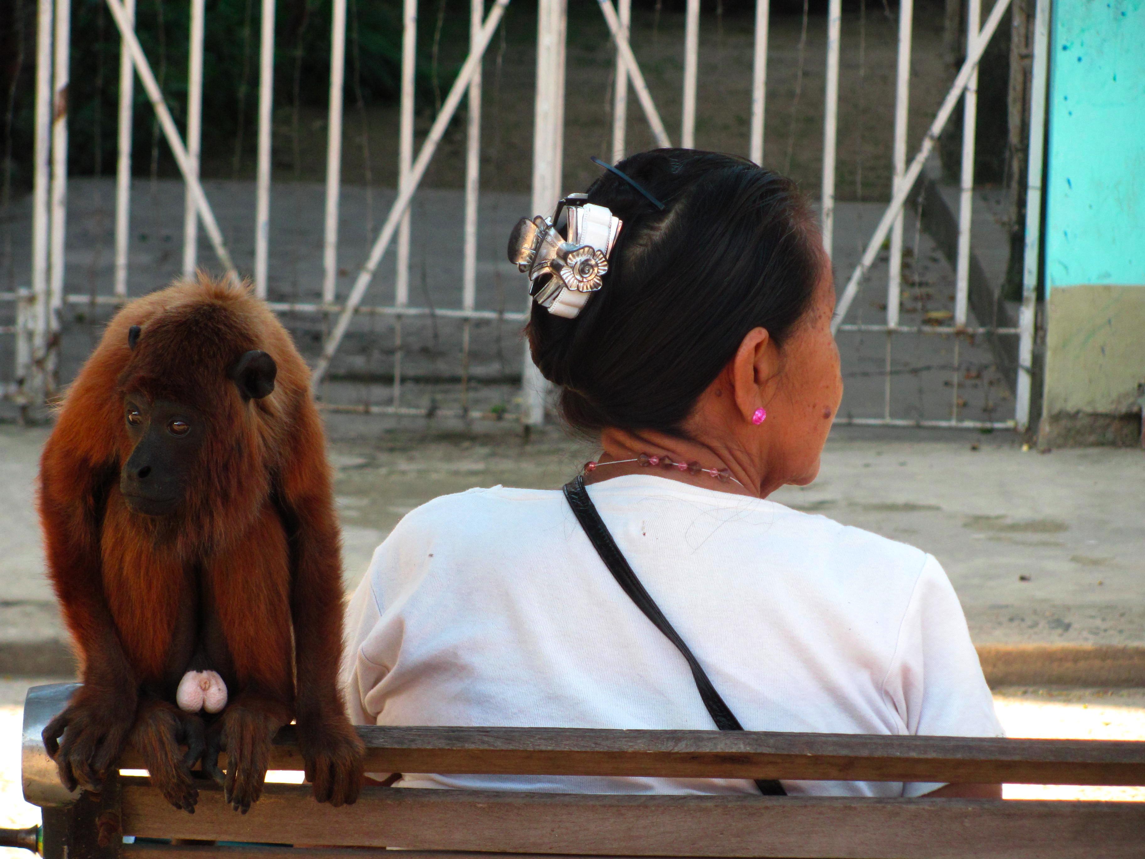 Wandering the streets of the small town of Rurrenabaque in Bolivia I spotted this scene. I grabbed my camera to capture the juxtaposition; woman and monkey, back to back. As the shutter clicked she sensed my presence and swiveled her head over her left shoulder. I got the second shot and a few nice minutes of conversation too.